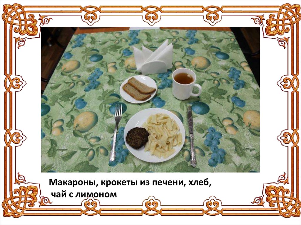 Макароны, крокеты из печени, хлеб,чай с лимоном