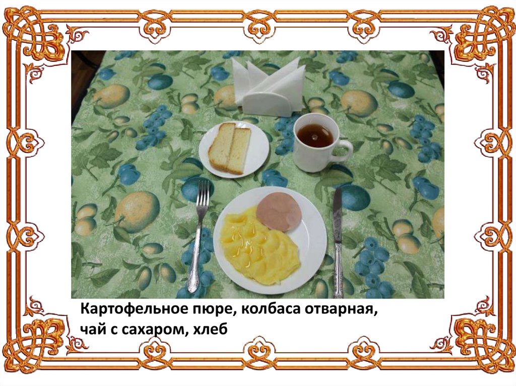 Картофельное пюре, колбаса отварная,чай с сахаром, хлеб