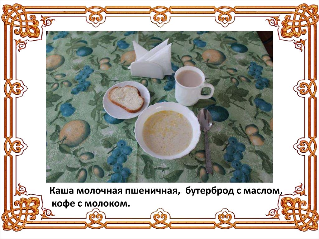 Каша молочная пшеничная, бутерброд с маслом,кофе с молоком.
