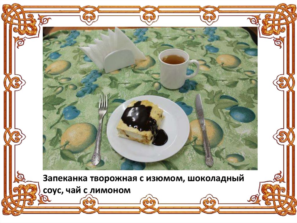 Запеканка творожная с изюмом, шоколадныйсоус, чай с лимоном