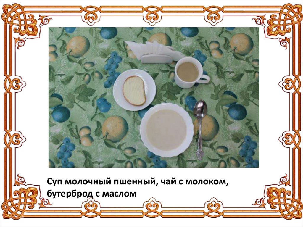 Суп молочный пшенный, чай с молоком,бутерброд с маслом