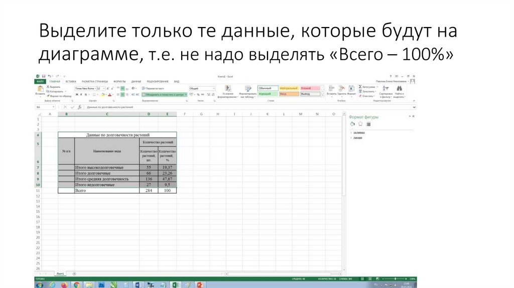 Выделите только те данные, которые будут надиаграмме, т.е. не надо выделять «Всего – 100%»