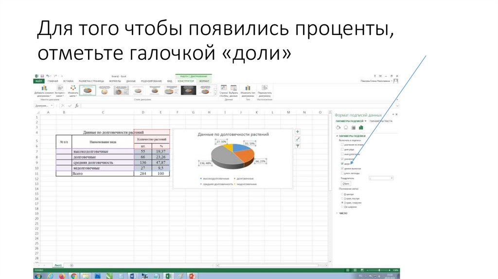 Для того чтобы появились проценты,отметьте галочкой «доли»