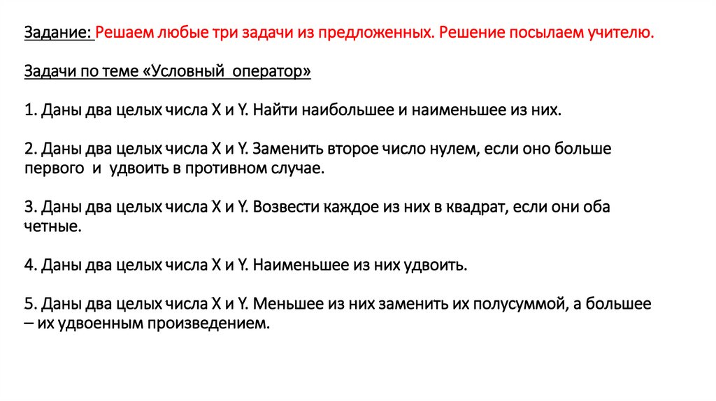 Задание: Решаем любые три задачи из предложенных. Решение посылаем учителю.Задачи по теме «Условный оператор»