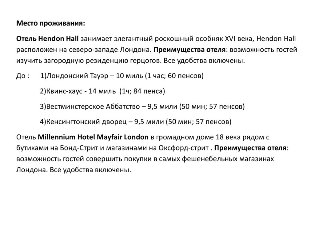 Подцель бригады: проживание экскурсионных групп в отелях Лондона.