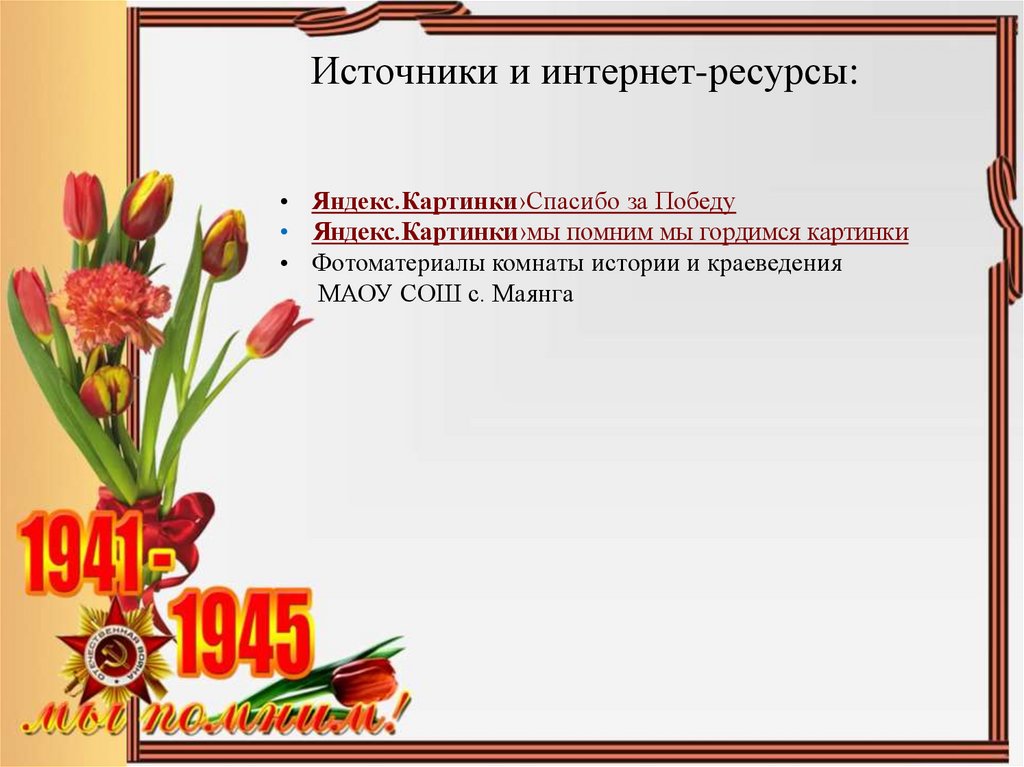 Источники и интернет-ресурсы:• Яндекс.Картинки›Спасибо за Победу