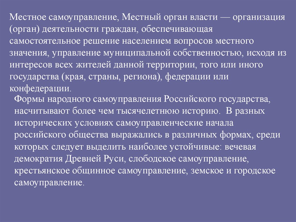 Местное самоуправление, Местный орган власти — организация(орган) деятельности граждан, обеспечивающая