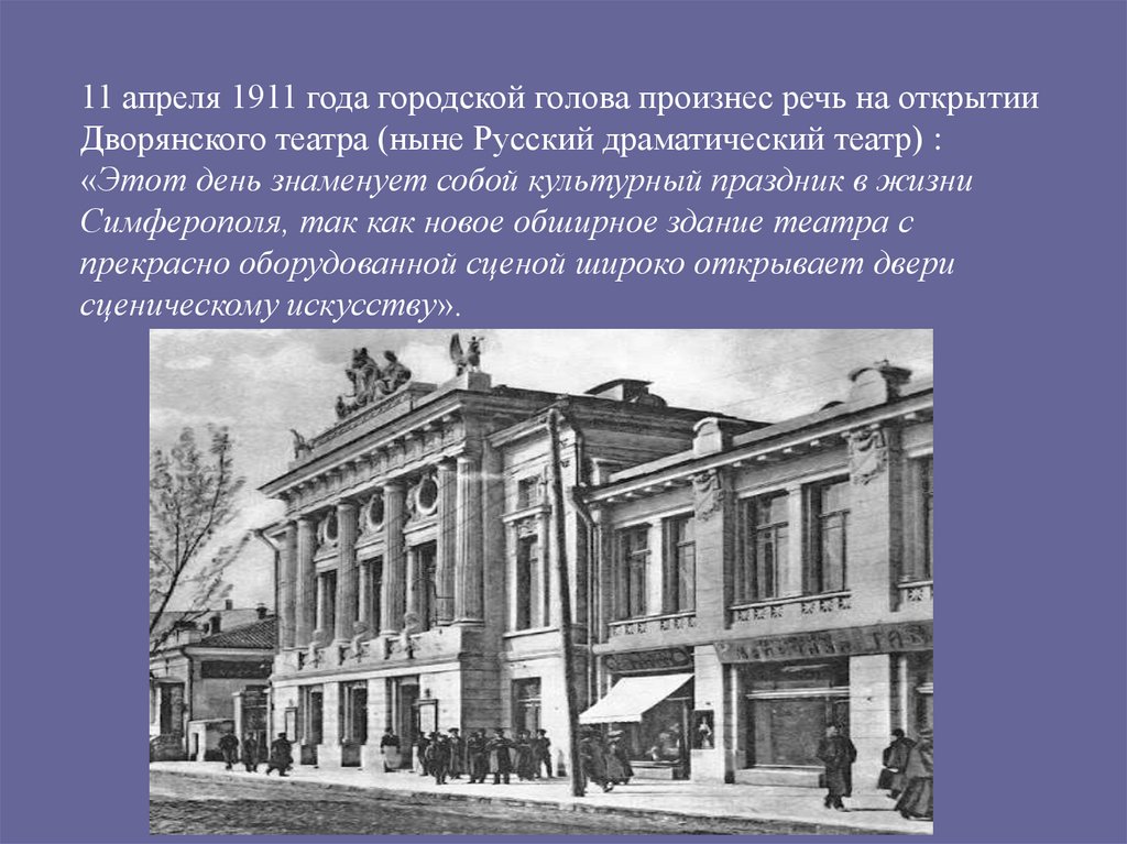 11 апреля 1911 года городской голова произнес речь на открытииДворянского театра (ныне Русский драматический театр) :