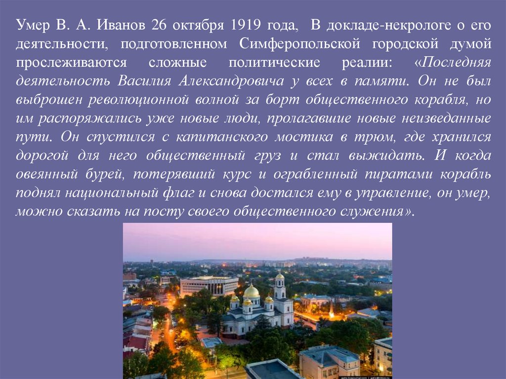 Умер В. А. Иванов 26 октября 1919 года, В докладе-некрологе о егодеятельности, подготовленном Симферопольской городской думой