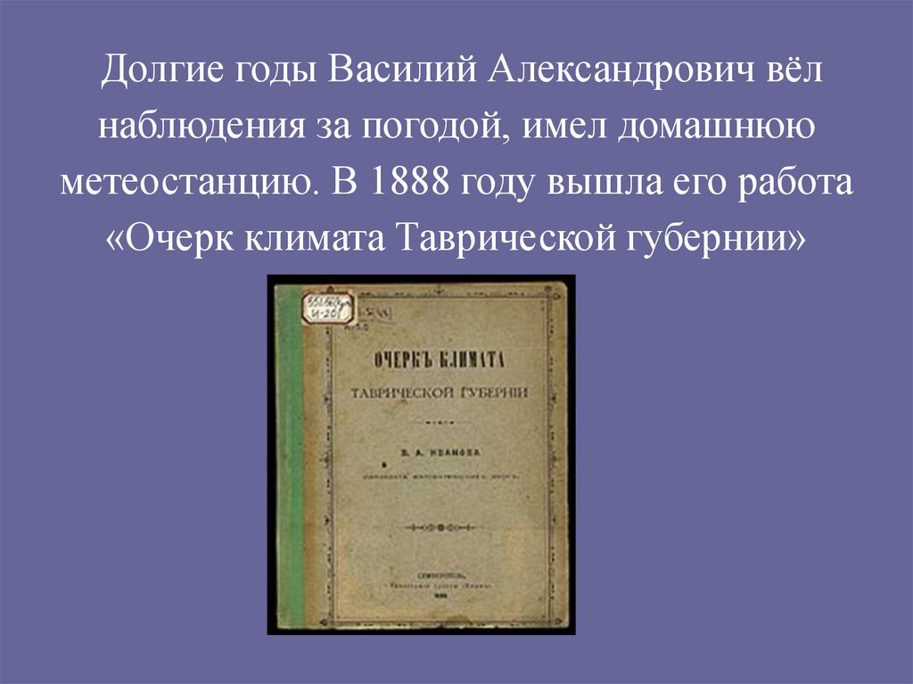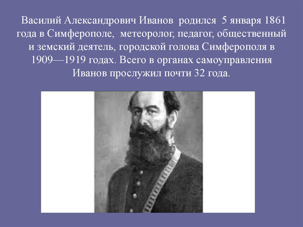 Василий Александрович Иванов родился 5 января 1861года в Симферополе, метеоролог, педагог, общественный