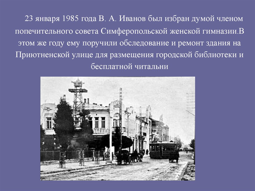 23 января 1985 года В. А. Иванов был избран думой членомпопечительного совета Симферопольской женской гимназии.В
