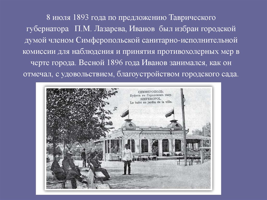 8 июля 1893 года по предложению Таврическогогубернатора П.М. Лазарева, Иванов был избран городской