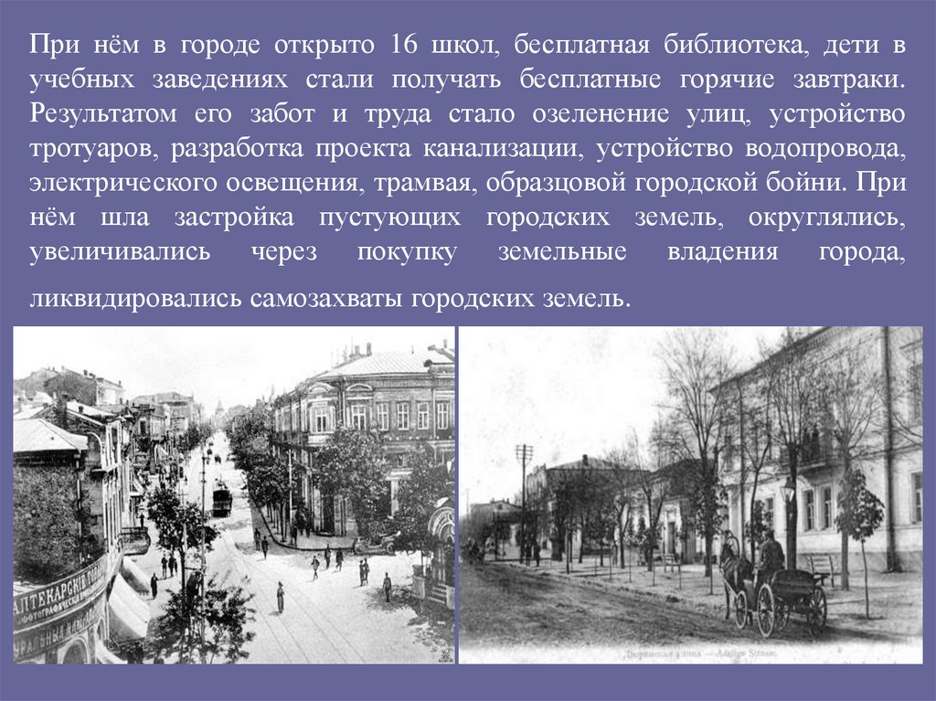 Результатом его забот и труда стало озеленение улиц, устройство