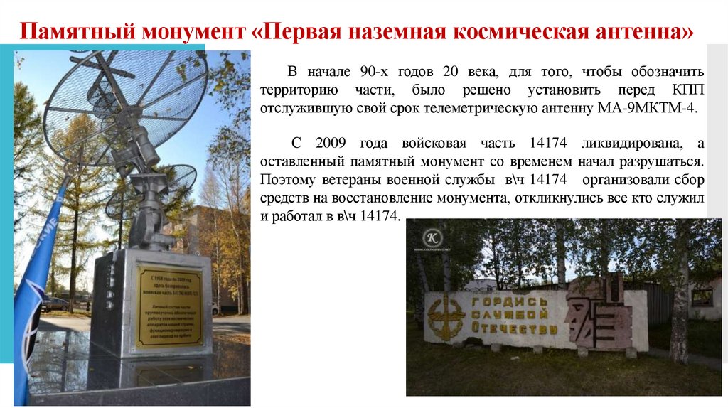 Памятный монумент «Первая наземная космическая антенна»В начале 90-х годов 20 века, для того, чтобы обозначить