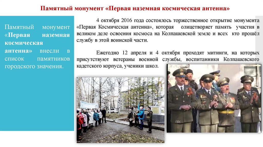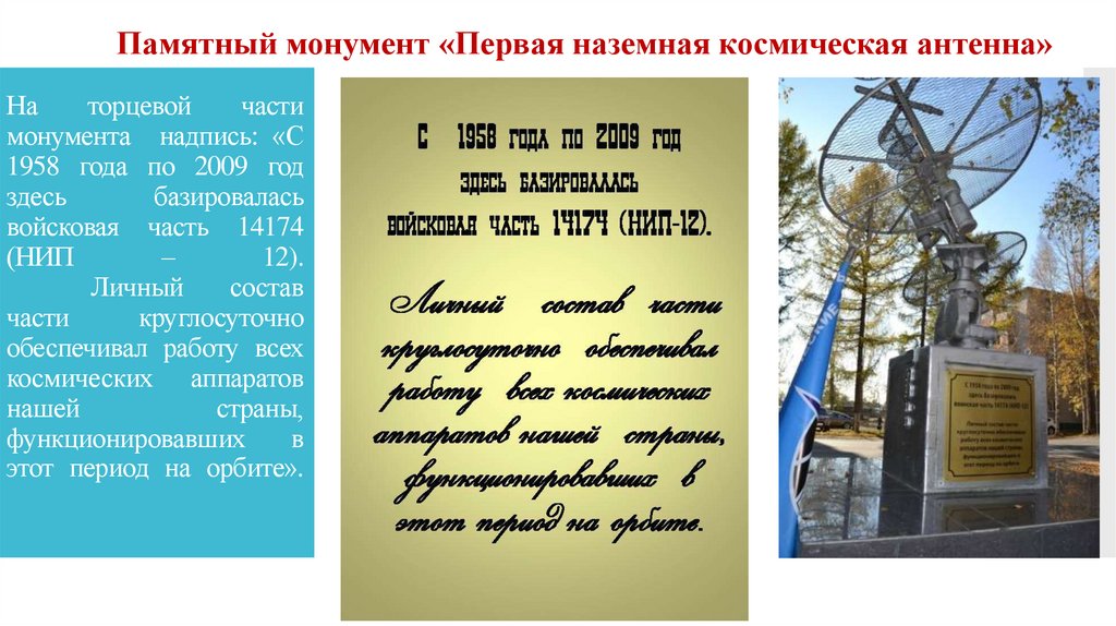 Памятный монумент «Первая наземная космическая антенна»4 октября 2016 года состоялось торжественное открытие монумента