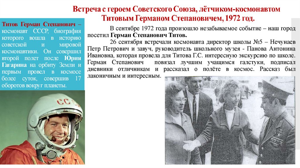 Встреча с героем Советского Союза, лётчиком-космонавтомТитовым Германом Степановичем, 1972 год.