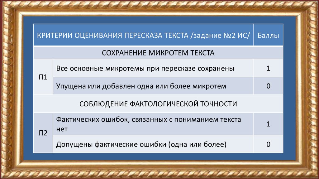 КРИТЕРИИ ОЦЕНИВАНИЯ ПЕРЕСКАЗА ТЕКСТА /задание №2 ИС/ БаллыСОХРАНЕНИЕ МИКРОТЕМ ТЕКСТА