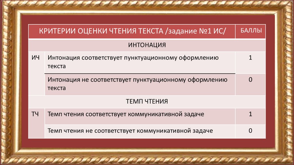 КРИТЕРИИ ОЦЕНКИ ЧТЕНИЯ ТЕКСТА /задание №1 ИС/БАЛЛЫ