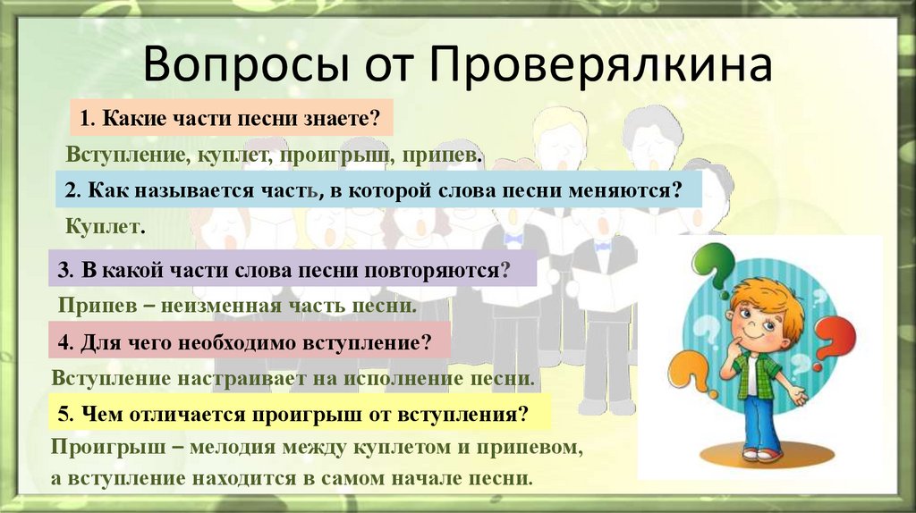 Вопросы от Проверялкина1. Какие части песни знаете?