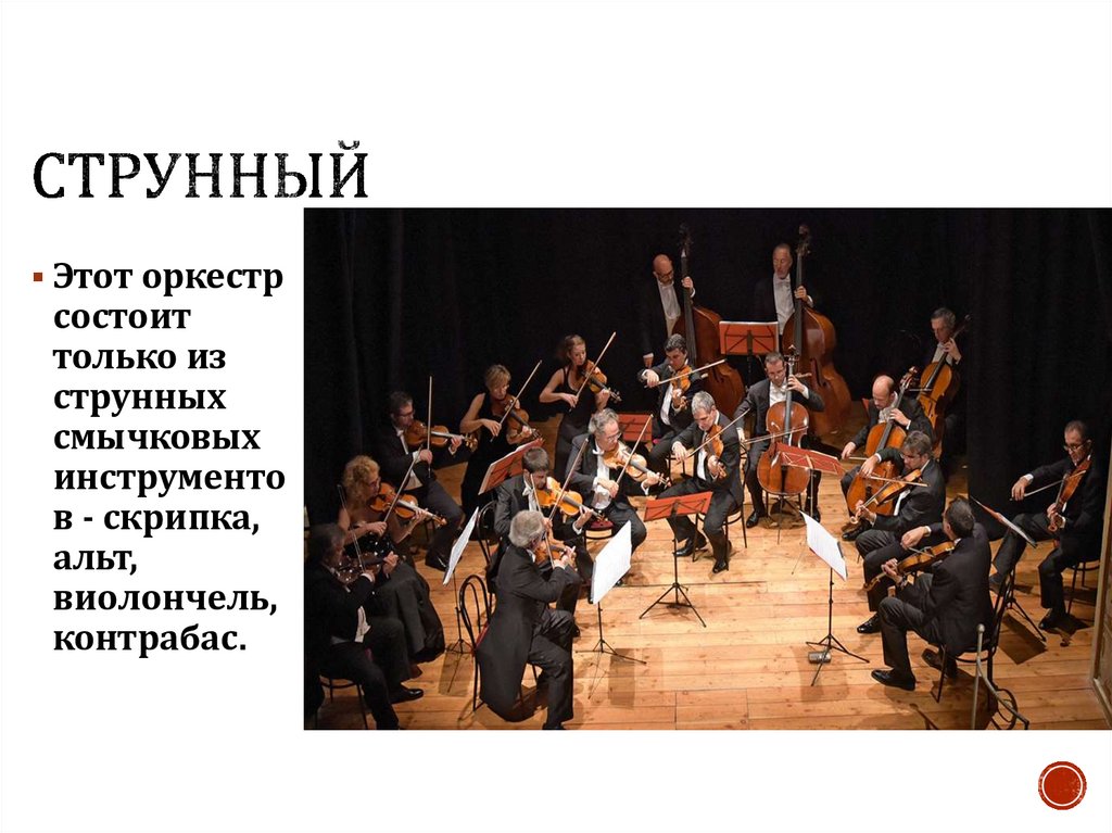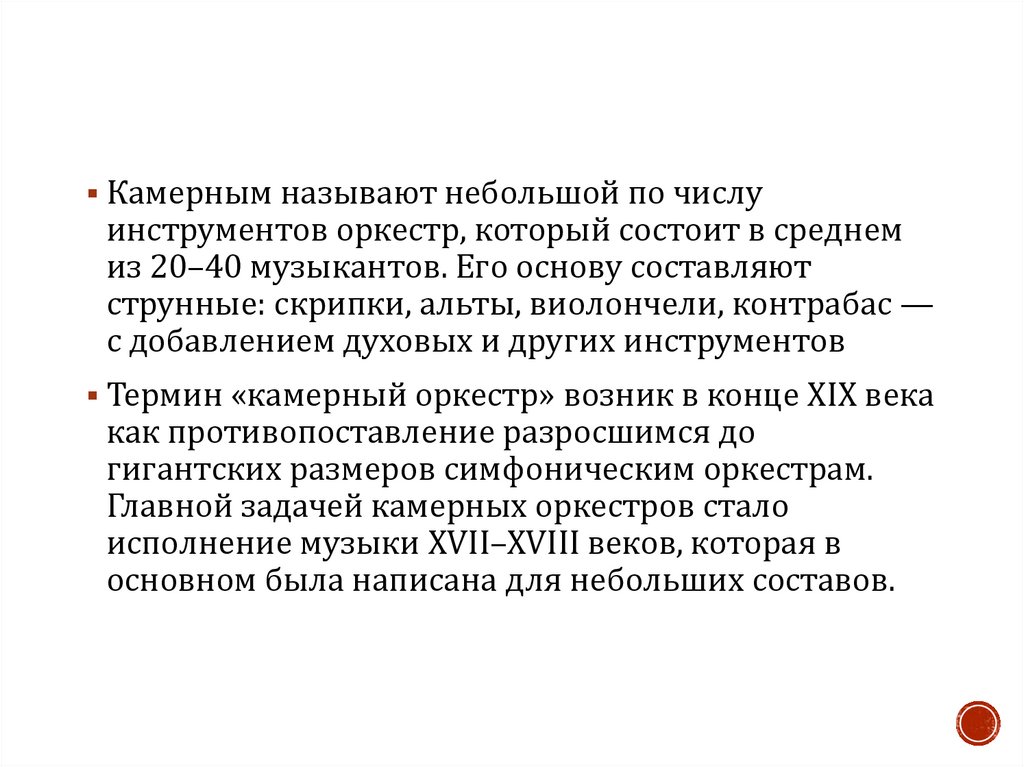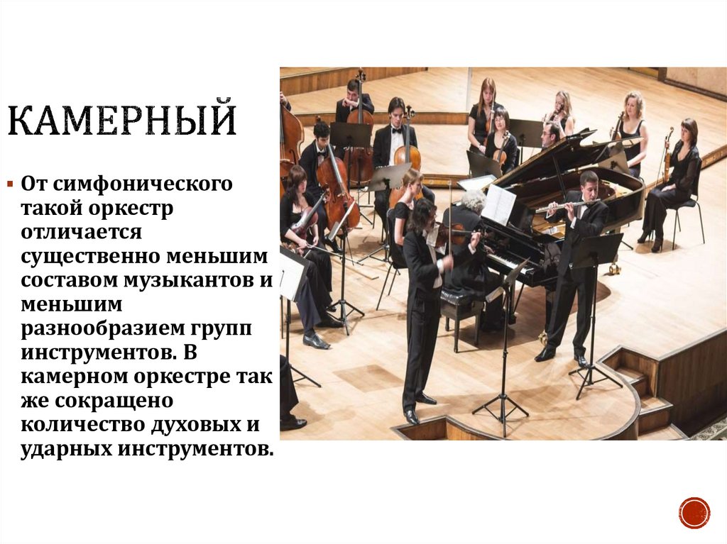 Камерным называют небольшой по числуинструментов оркестр, который состоит в среднем