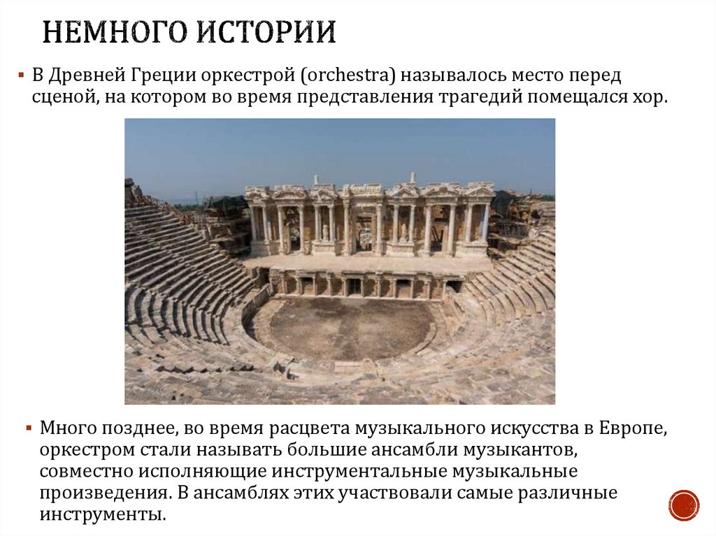 В Древней Греции оркестрой (orchestra) называлось место передсценой, на котором во время представления трагедий помещался хор.