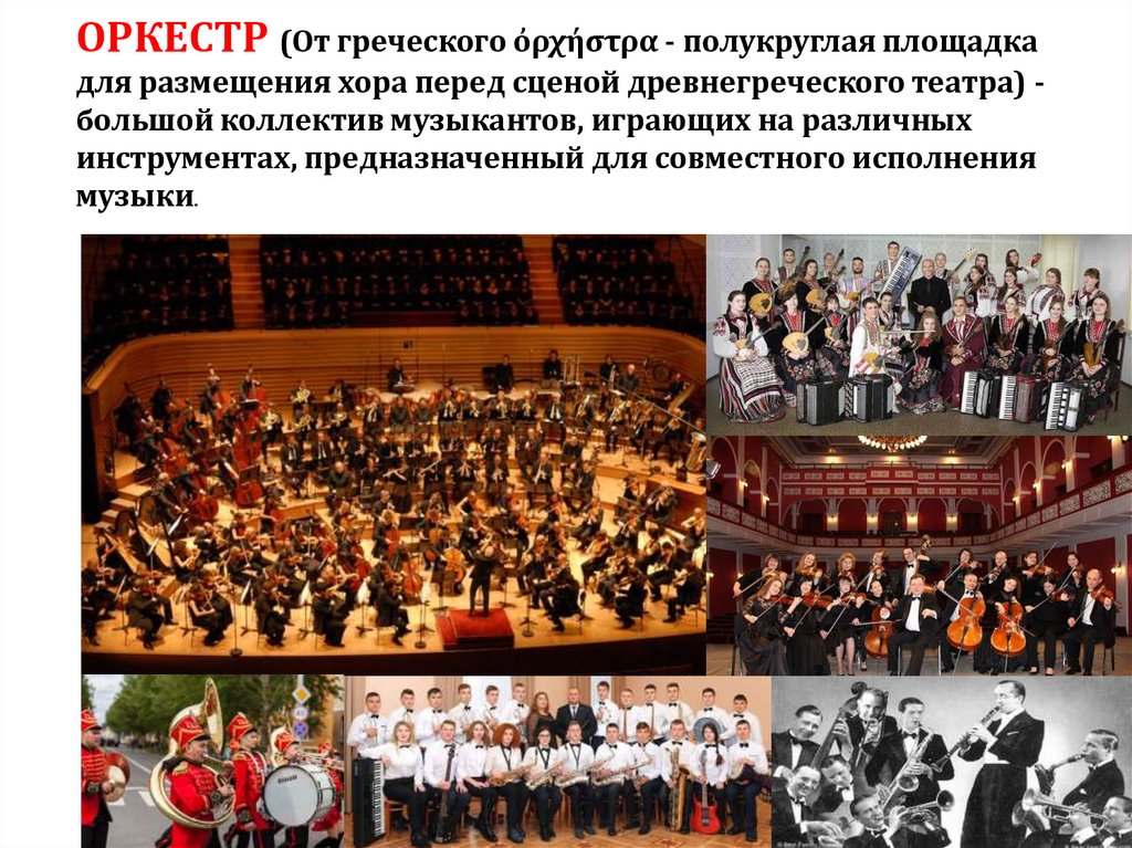 ОРКЕСТР (От греческого ὀρχήστρα - полукруглая площадкадля размещения хора перед сценой древнегреческого театра) большой коллектив музыкантов, играющих на различных