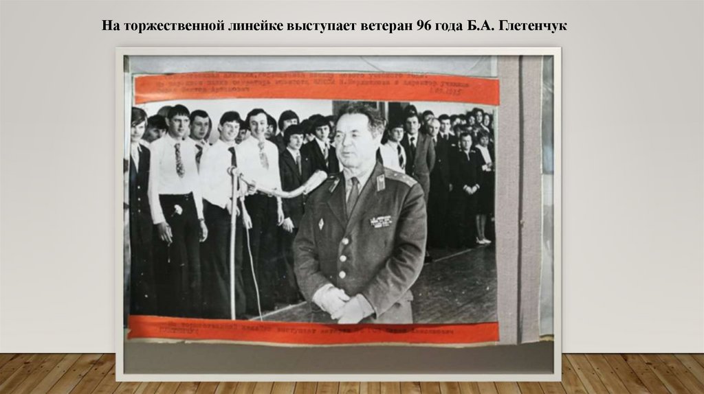 На торжественной линейке выступает ветеран 96 года Б.А. Глетенчук9.