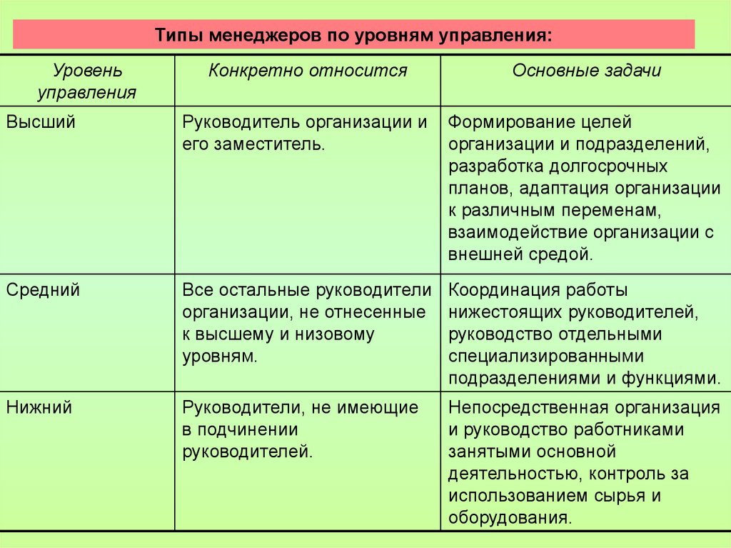 Типы менеджеров по уровням управления:Уровень