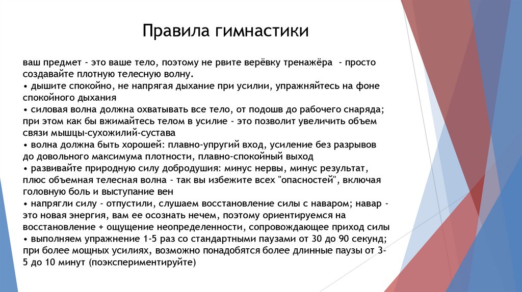 Правила гимнастикиваш предмет - это ваше тело, поэтому не рвите верёвку тренажёра - просто