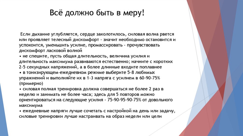 Всё должно быть в меру!Если дыхание углубляется, сердце заколотилось, силовая волна рвется