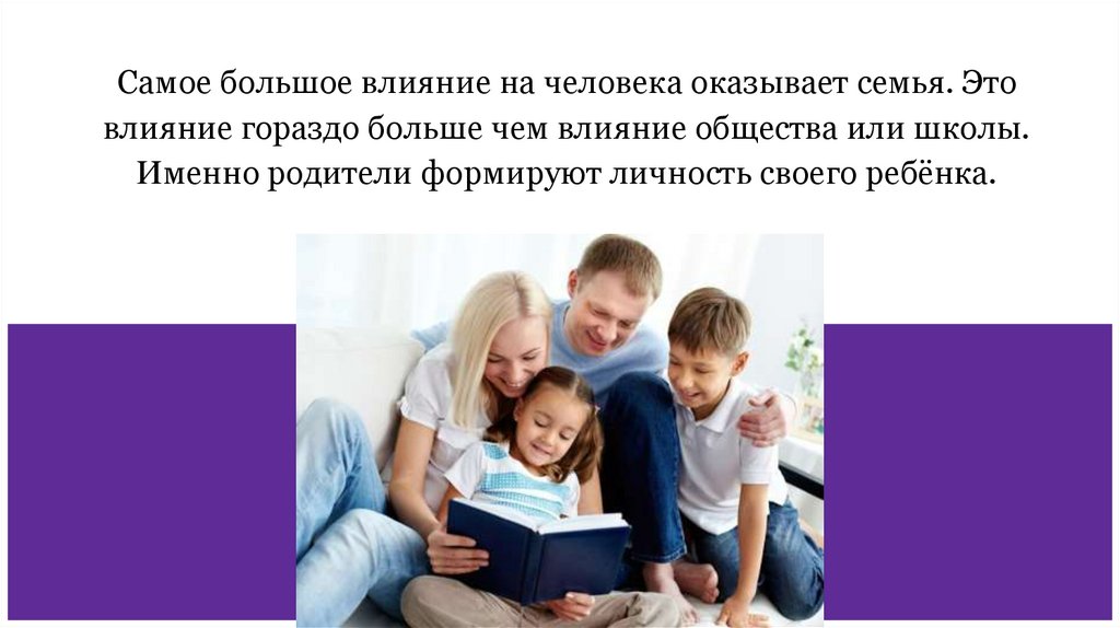 Самое большое влияние на человека оказывает семья. Этовлияние гораздо больше чем влияние общества или школы.