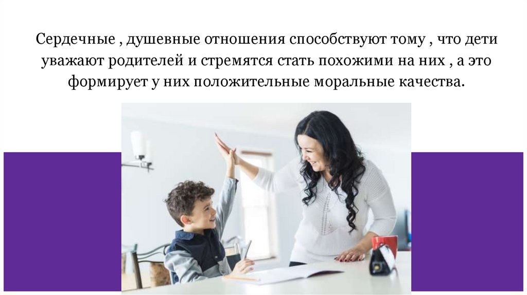 Сердечные , душевные отношения способствуют тому , что детиуважают родителей и стремятся стать похожими на них , а это
