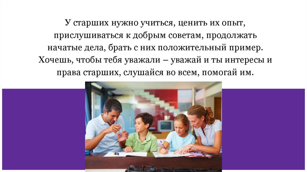 У старших нужно учиться, ценить их опыт,прислушиваться к добрым советам, продолжать