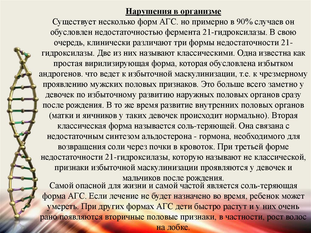 Нарушения в организмеСуществует несколько форм АГС. но примерно в 90% случаев он