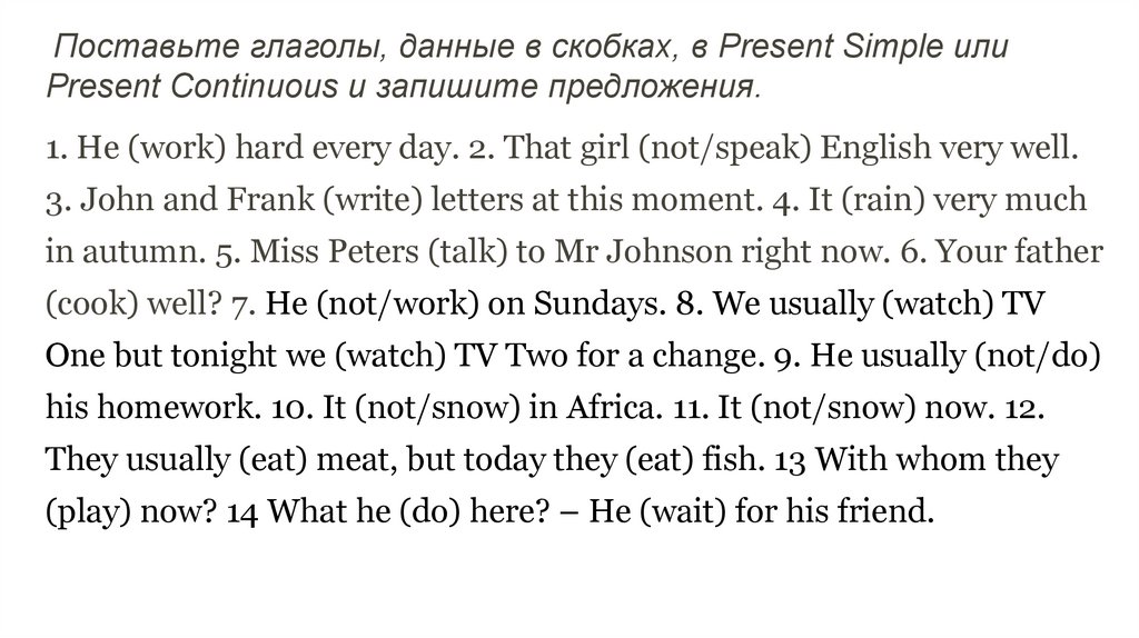 Поставьте глаголы, данные в скобках, в Present Simple илиPresent Continuous и запишите предложения.