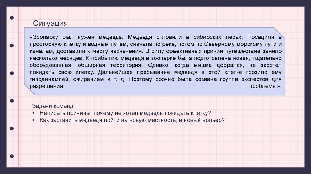 Ситуация«Зоопарку был нужен медведь. Медведя отловили в сибирских лесах. Посадили в