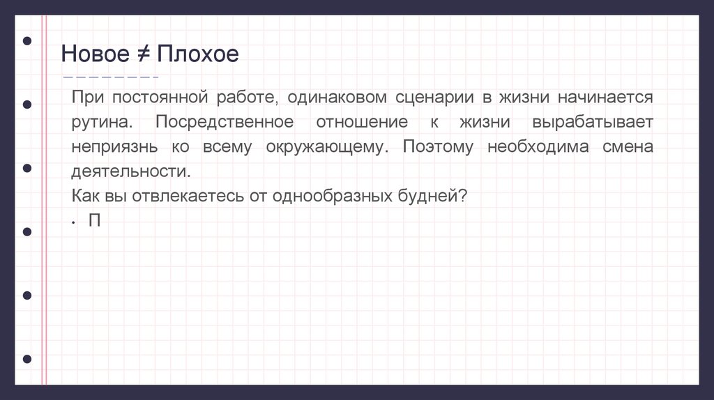 Новое ≠ ПлохоеПри постоянной работе, одинаковом сценарии в жизни начинается