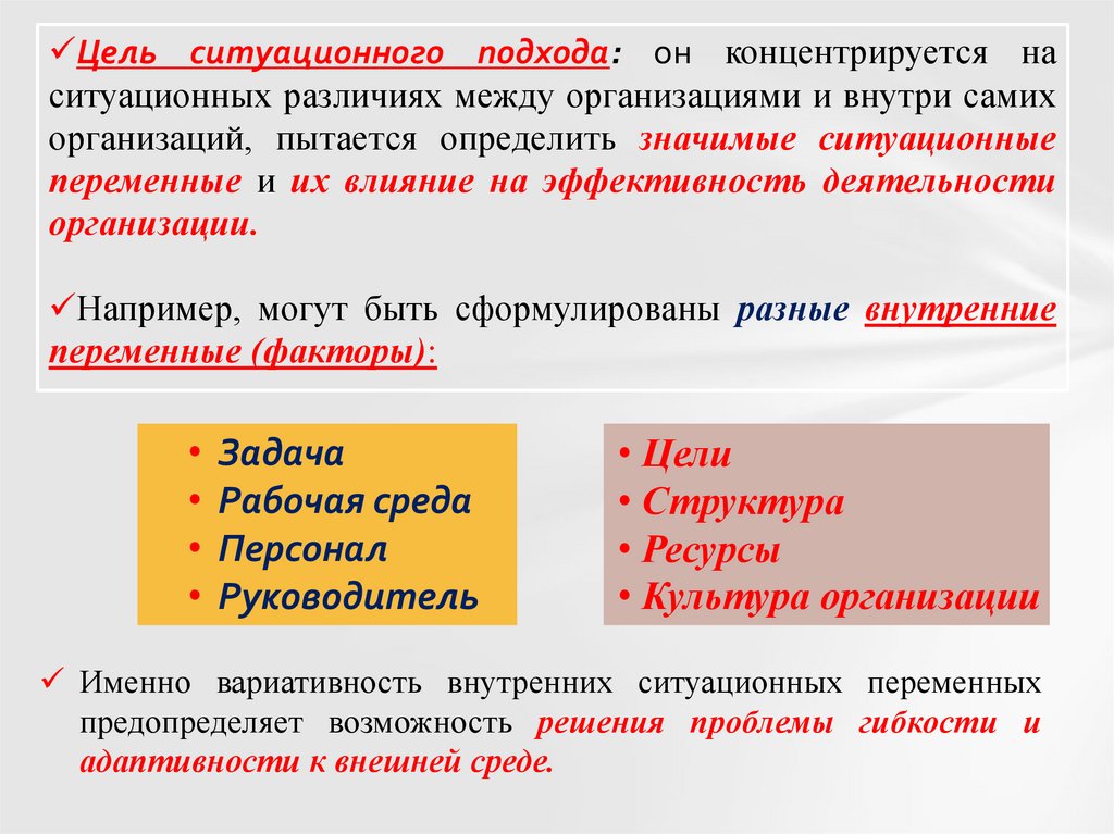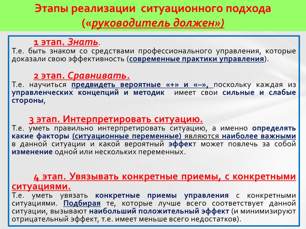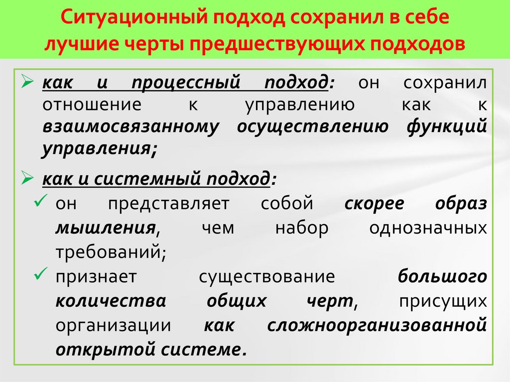 Ситуационный подход сохранил в себелучшие черты предшествующих подходов