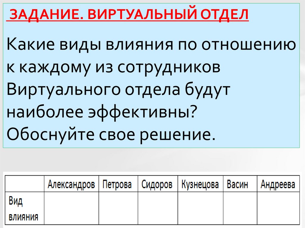 ЗАДАНИЕ. ВИРТУАЛЬНЫЙ ОТДЕЛКакие виды влияния по отношению