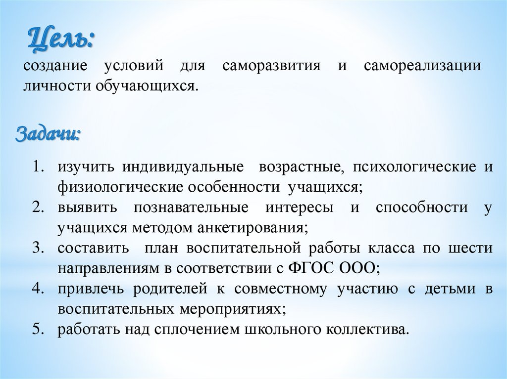 Цель:создание условий для саморазвития и