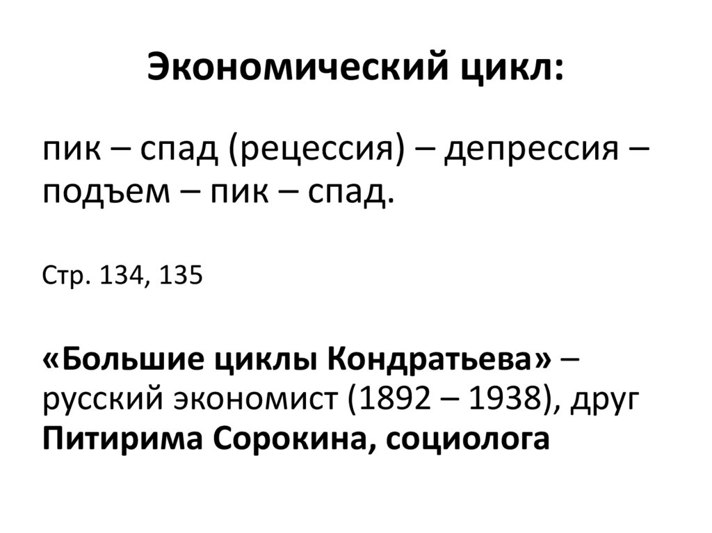 Экономический цикл:пик – спад (рецессия) – депрессия –