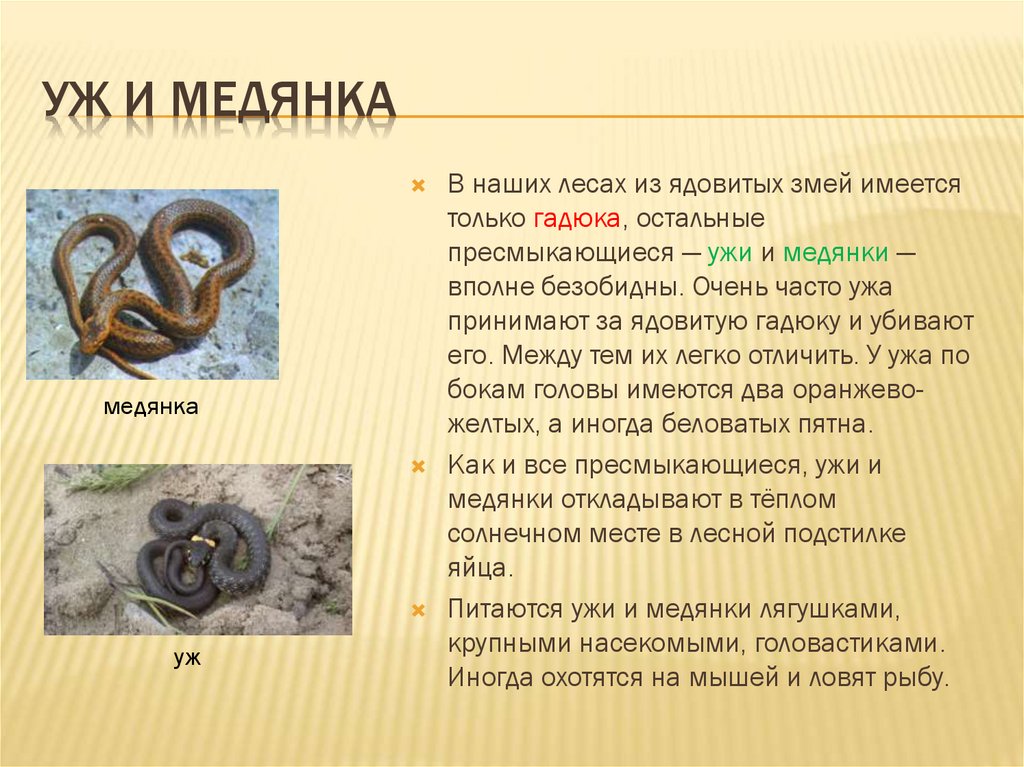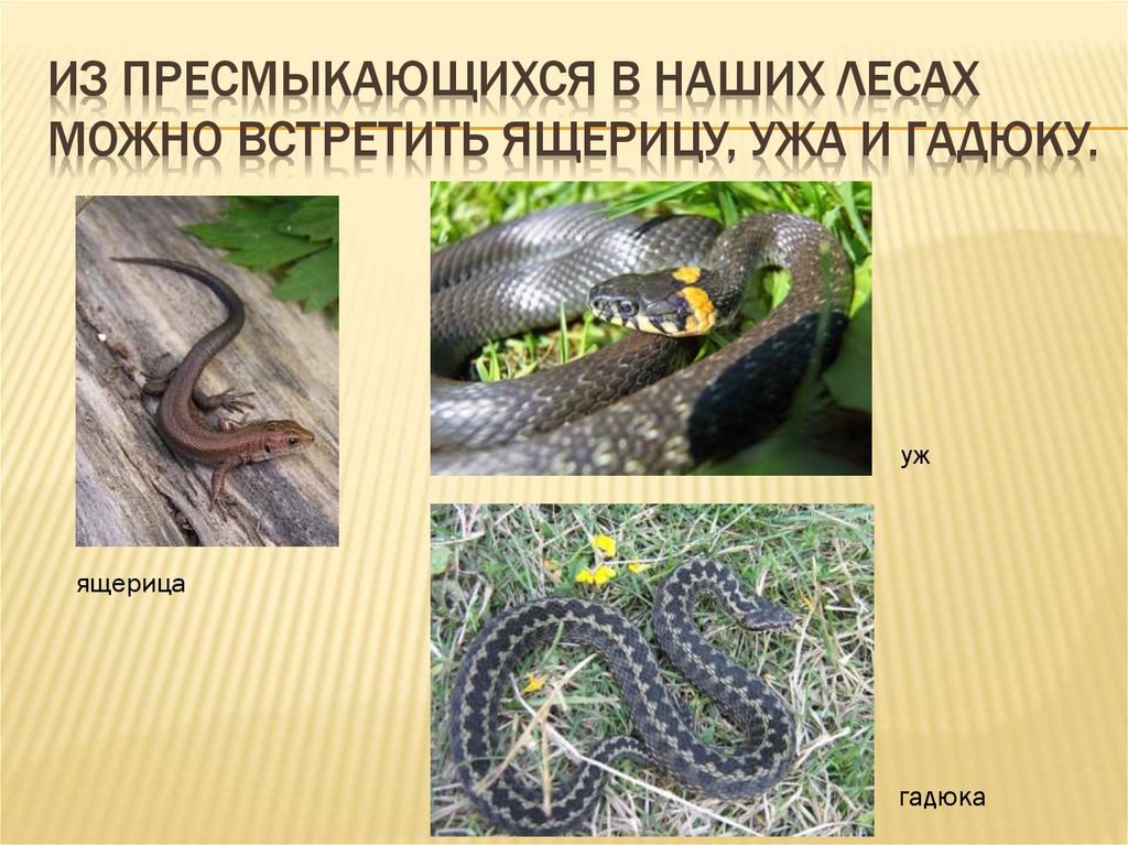ИЗ ПРЕСМЫКАЮЩИХСЯ В НАШИХ ЛЕСАХМОЖНО ВСТРЕТИТЬ ЯЩЕРИЦУ, УЖА И ГАДЮКУ.