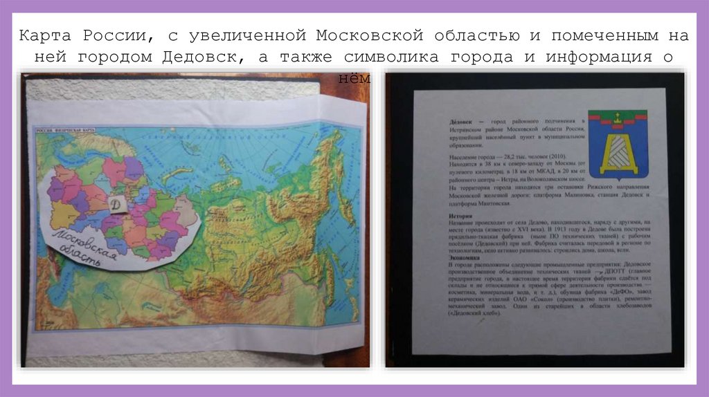 Карта России, с увеличенной Московской областью и помеченным наней городом Дедовск, а также символика города и информация о