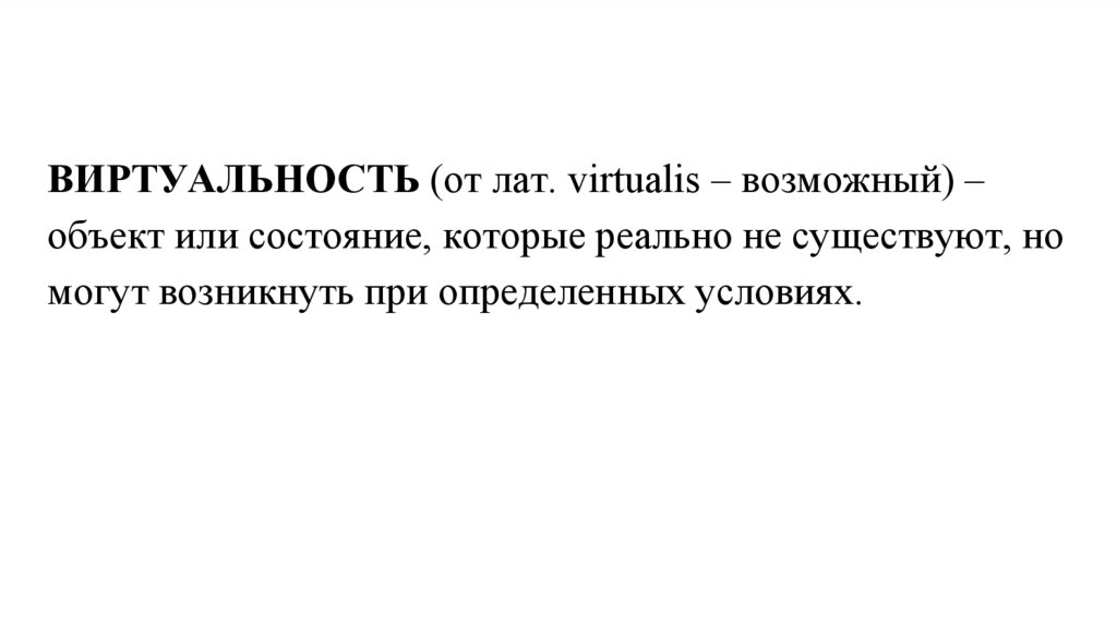 ВИРТУАЛЬНОСТЬ (от лат. virtualis – возможный) –объект или состояние, которые реально не существуют, но