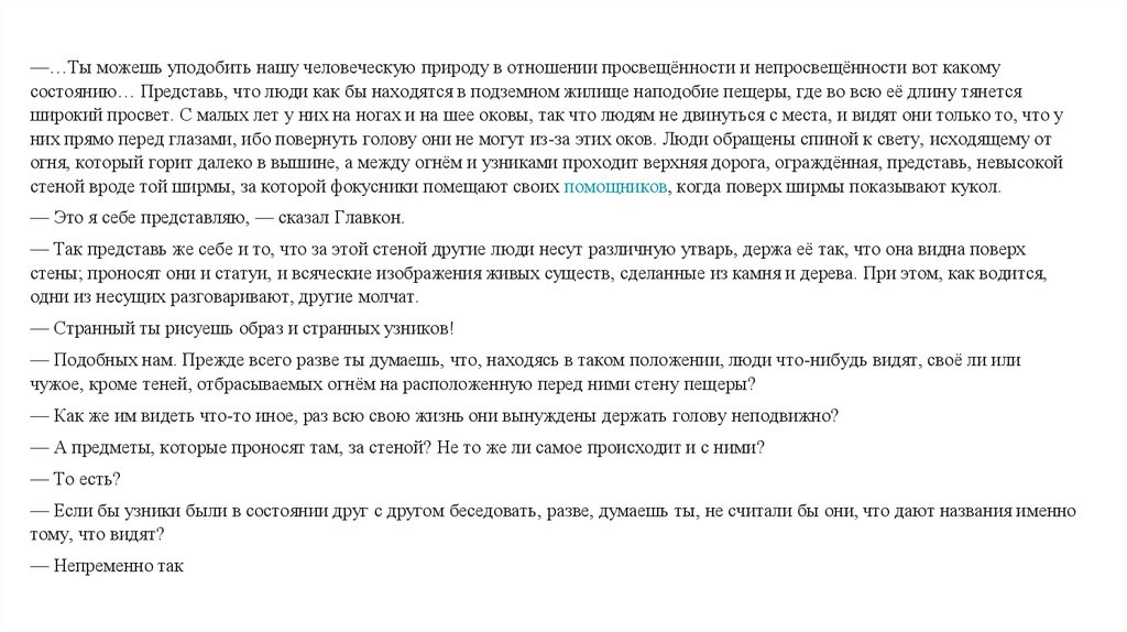 —…Ты можешь уподобить нашу человеческую природу в отношении просвещённости и непросвещённости вот какомусостоянию… Представь, что люди как бы находятся в подземном жилище наподобие пещеры, где во всю её длину тянется