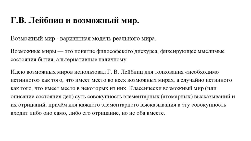 Г.В. Лейбниц и возможный мир.Возможный мир - вариантная модель реального мира.