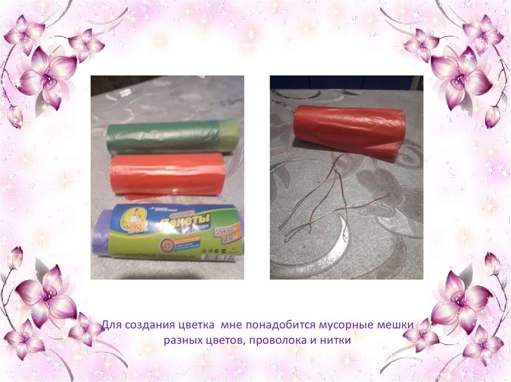 Для создания цветка мне понадобится мусорные мешкиразных цветов, проволока и нитки