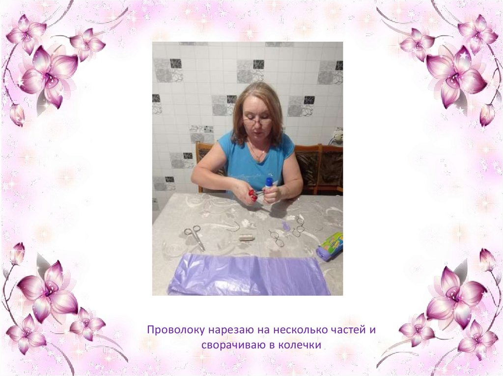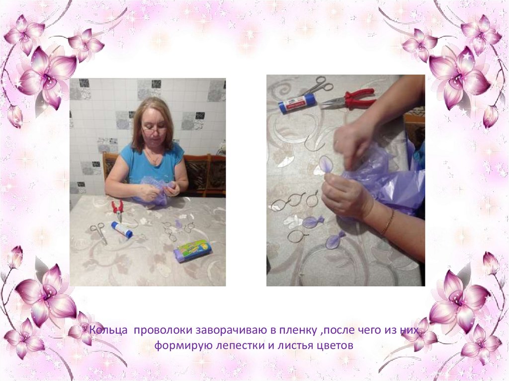 Кольца проволоки заворачиваю в пленку ,после чего из нихформирую лепестки и листья цветов