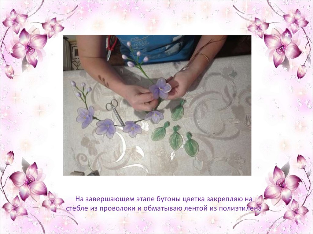 На завершающем этапе бутоны цветка закрепляю настебле из проволоки и обматываю лентой из полиэтилена