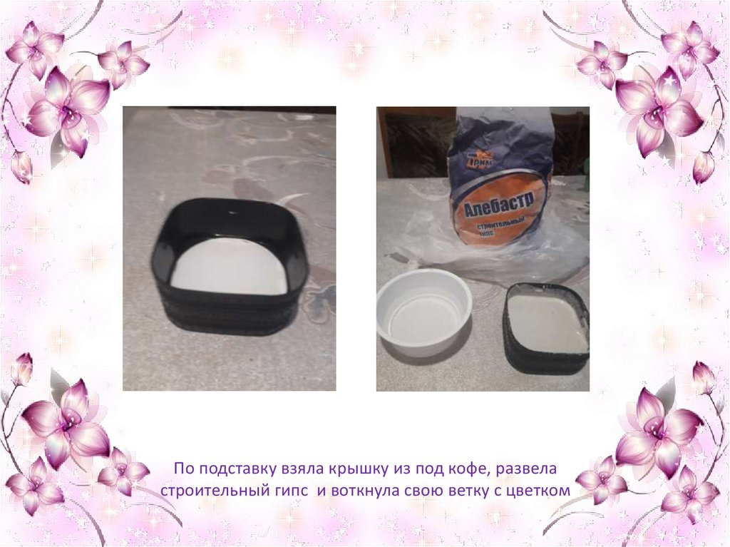 По подставку взяла крышку из под кофе, развеластроительный гипс и воткнула свою ветку с цветком